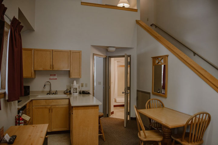 Our townhouses accommodate 4-6 people. Each townhouse features a private bedroom downstairs with one double bed, a open loft upstairs with two twin beds, and a sleeper sofa in the living room that serves as a double bed.